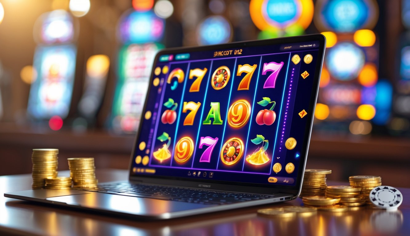 Seorang pengguna sedang bermain permainan slot online di perangkat modern dengan koin emas dan chip poker di atas meja kayu.